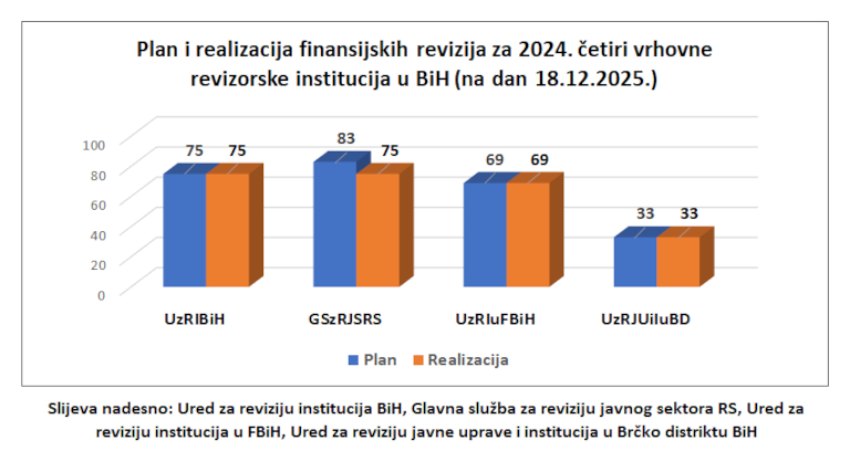 Podsjećamo da su ostale tri vrhovne revizorske institucije u BiH svoje planove finansijskih revizija davno realizovale. (Državni ured za reviziju 16.09.2025., Federalni 29.09.2025. a Ured Brčko distrikta 06.08.2025.). Državnom uredu za reviziju ostala su za objavu još samo dva izvještaja o praćenju realizacije preporuka iz ranije objavljenih izvještaja revizije učinka, Federalnom uredu dva izvještaja o revizijama učinka, a Uredu Brčko distrikta jedan izvještaja o praćenju realizacije preporuka iz ranije objavljenih izvještaja revizije učinka. I planovi za 2026. svima.