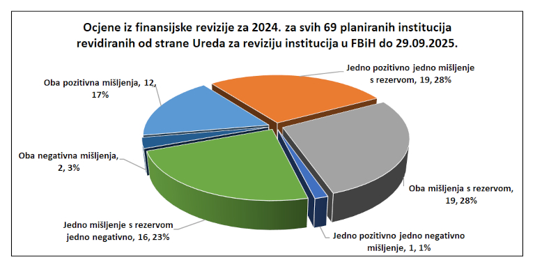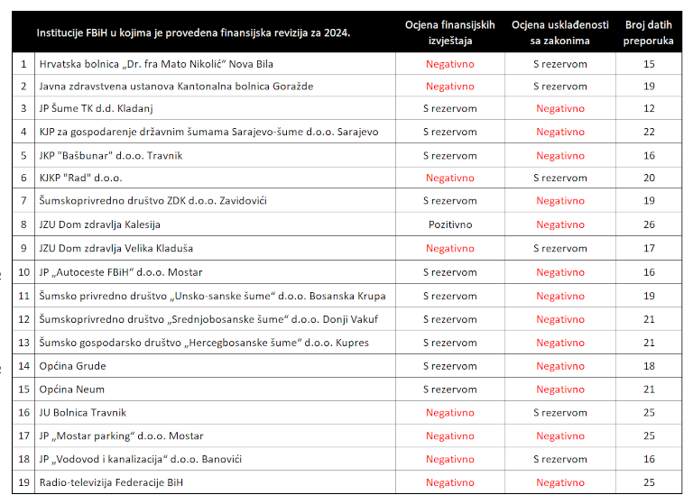 U finansijskoj reviziji za 2024. negativne ocjene Ureda za reviziju dobilo je 5 zdravstvenih ustanova (3 bolnice i 2 doma zdravlja), 6 javnih preduzeća za upravljanje državnim šumama, 4 javna komunalna preduzeća, dvije općine, te, JP „Autoceste FBiH“ d.o.o. Mostar i Javni servis RTV Federacije BiH.